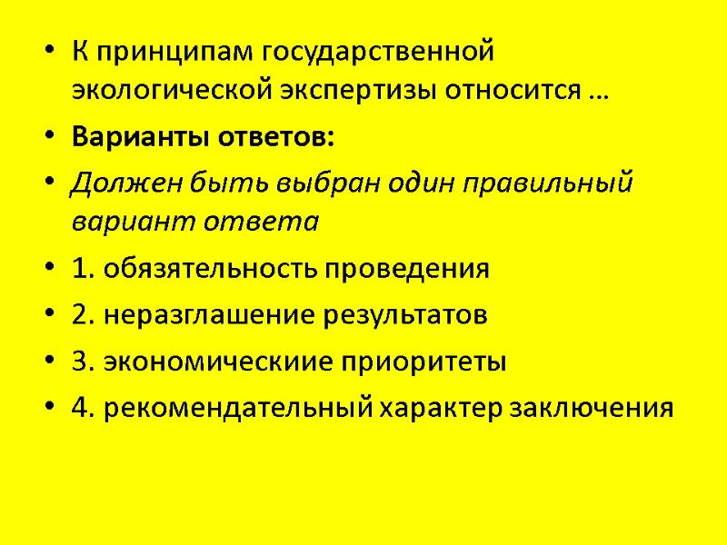 К принципам государственной экологической экспертизы относится … Варианты ответов: Должен быть выбран один правильный вариант ответа 1. обязятельность проведения 2. неразглашение результатов 3. экономическиие приоритеты 4. рекомендательный характер заключения