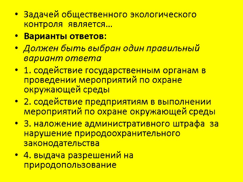 Задачей общественного экологического контроля является… Варианты ответов: Должен быть выбран один правильный вариант ответа 1. содействие государственным органам в проведении мероприятий по охране окружающей среды 2. содействие предприятиям в выполнении мероприятий по охране окружающей среды 3. наложение административного штрафа за нарушение природоохранительного законодательства 4. выдача разрешений на природопользование