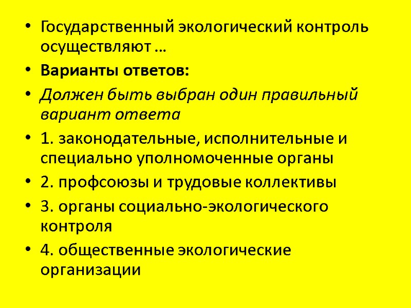 Государственный экологический контроль осуществляют … Варианты ответов: Должен быть выбран один правильный вариант ответа 1. законодательные, исполнительные и специально уполномоченные органы 2. профсоюзы и трудовые коллективы 3. органы социально-экологического контроля 4. общественные экологические организации