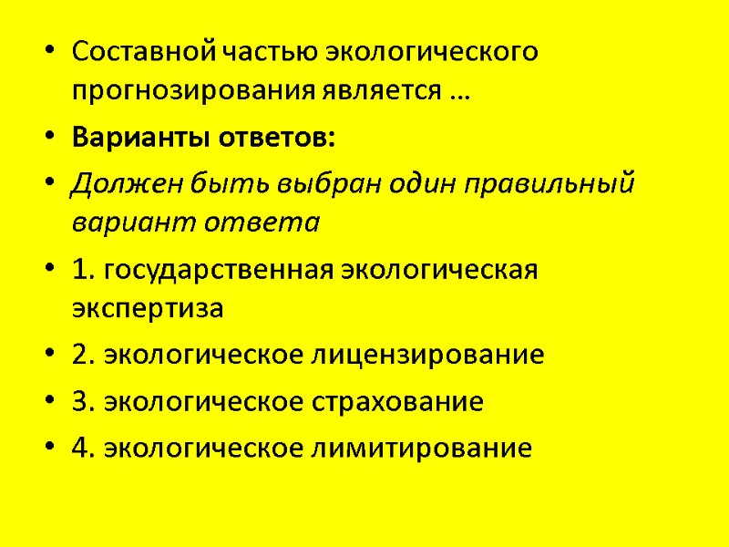 Составной частью экологического прогнозирования является … Варианты ответов: Должен быть выбран один правильный вариант ответа 1. государственная экологическая экспертиза 2. экологическое лицензирование 3. экологическое страхование 4. экологическое лимитирование
