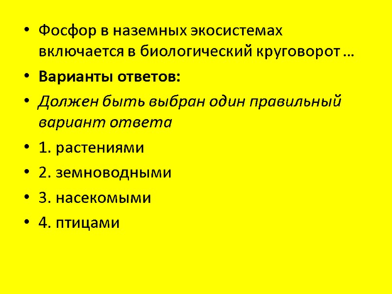 Фосфор в наземных экосистемах включается в биологический круговорот … Варианты ответов: Должен быть выбран один правильный вариант ответа 1. растениями 2. земноводными 3. насекомыми 4. птицами