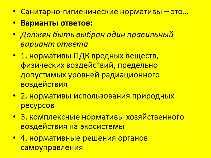 Санитарно-гигиенические нормативы – это… Варианты ответов: Должен быть выбран один правильный вариант ответа 1. нормативы ПДК вредных веществ, физических воздействий, предельно допустимых уровней радиационного воздействия 2. нормативы использования природных ресурсов 3. комплексные нормативы хозяйственного воздействия на экосистемы 4. нормативные решения органов самоуправления