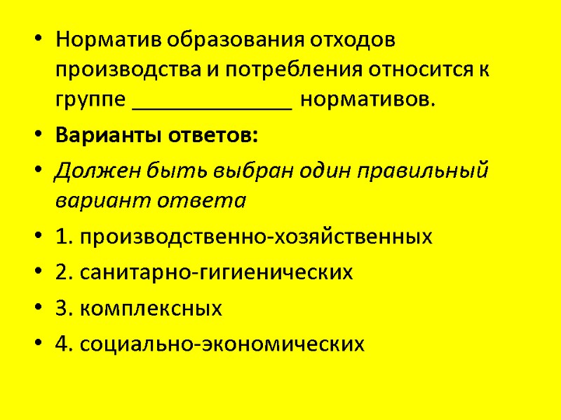 Норматив образования отходов производства и потребления относится к группе _____________ нормативов. Варианты ответов: Должен быть выбран один правильный вариант ответа 1. производственно-хозяйственных 2. санитарно-гигиенических 3. комплексных 4. социально-экономических
