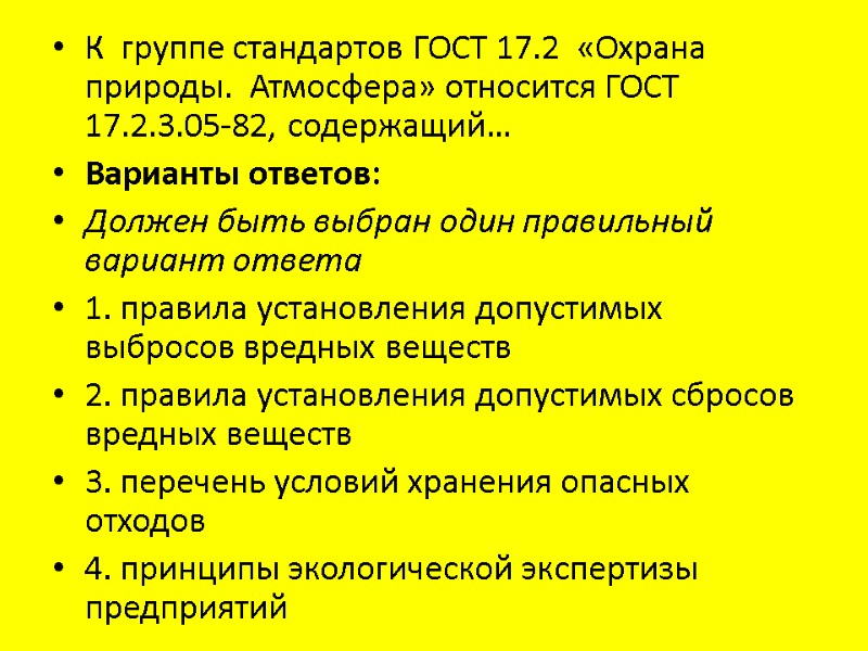 К группе стандартов ГОСТ 17.2 «Охрана природы. Атмосфера» относится ГОСТ 17.2.3.05-82, содержащий… Варианты ответов: Должен быть выбран один правильный вариант ответа 1. правила установления допустимых выбросов вредных веществ 2. правила установления допустимых сбросов вредных веществ 3. перечень условий хранения опасных отходов 4. принципы экологической экспертизы предприятий
