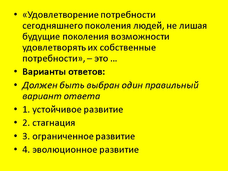 «Удовлетворение потребности сегодняшнего поколения людей, не лишая будущие поколения возможности удовлетворять их собственные потребности», – это … Варианты ответов: Должен быть выбран один правильный вариант ответа 1. устойчивое развитие 2. стагнация 3. ограниченное развитие 4. эволюционное развитие