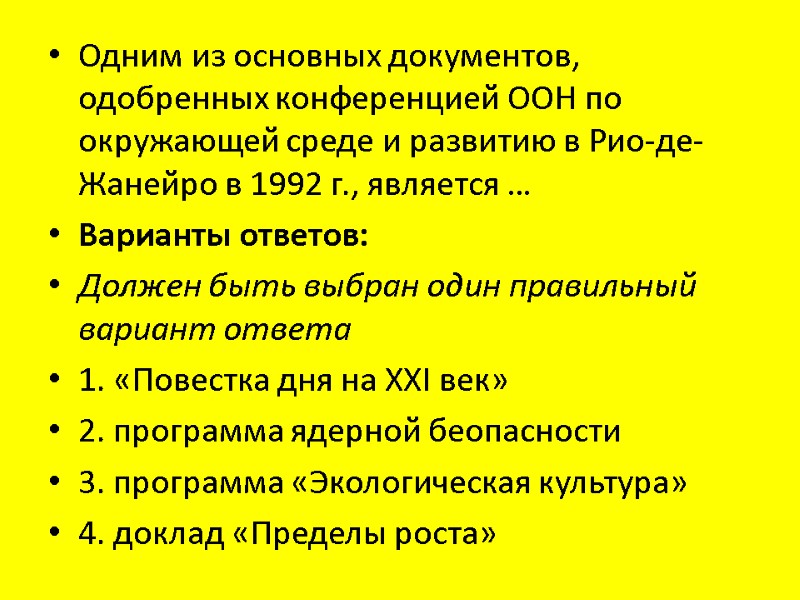 Одним из основных документов, одобренных конференцией ООН по окружающей среде и развитию в Рио-де-Жанейро в 1992 г., является … Варианты ответов: Должен быть выбран один правильный вариант ответа 1. «Повестка дня на XXI век» 2. программа ядерной беопасности 3. программа «Экологическая культура» 4. доклад «Пределы роста»