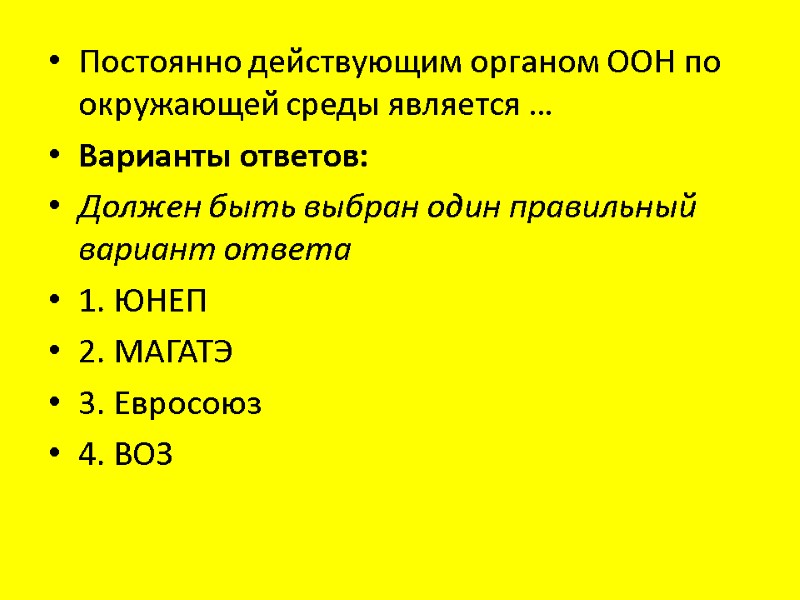 Постоянно действующим органом ООН по окружающей среды является … Варианты ответов: Должен быть выбран один правильный вариант ответа 1. ЮНЕП 2. МАГАТЭ 3. Евросоюз 4. ВОЗ