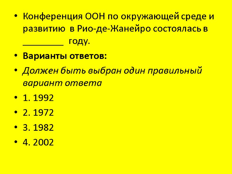 Конференция ООН по окружающей среде и развитию в Рио-де-Жанейро состоялась в ________ году. Варианты ответов: Должен быть выбран один правильный вариант ответа 1. 1992 2. 1972 3. 1982 4. 2002