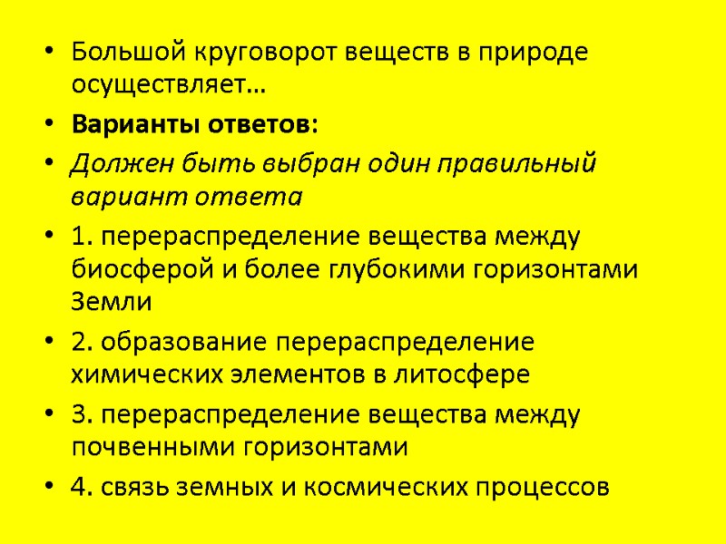Большой круговорот веществ в природе осуществляет… Варианты ответов: Должен быть выбран один правильный вариант ответа 1. перераспределение вещества между биосферой и более глубокими горизонтами Земли 2. образование перераспределение химических элементов в литосфере 3. перераспределение вещества между почвенными горизонтами 4. связь земных и космических процессов
