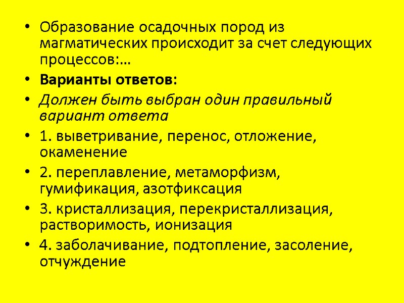 Образование осадочных пород из магматических происходит за счет следующих процессов:… Варианты ответов: Должен быть выбран один правильный вариант ответа 1. выветривание, перенос, отложение, окаменение 2. переплавление, метаморфизм, гумификация, азотфиксация 3. кристаллизация, перекристаллизация, растворимость, ионизация 4. заболачивание, подтопление, засоление, отчуждение