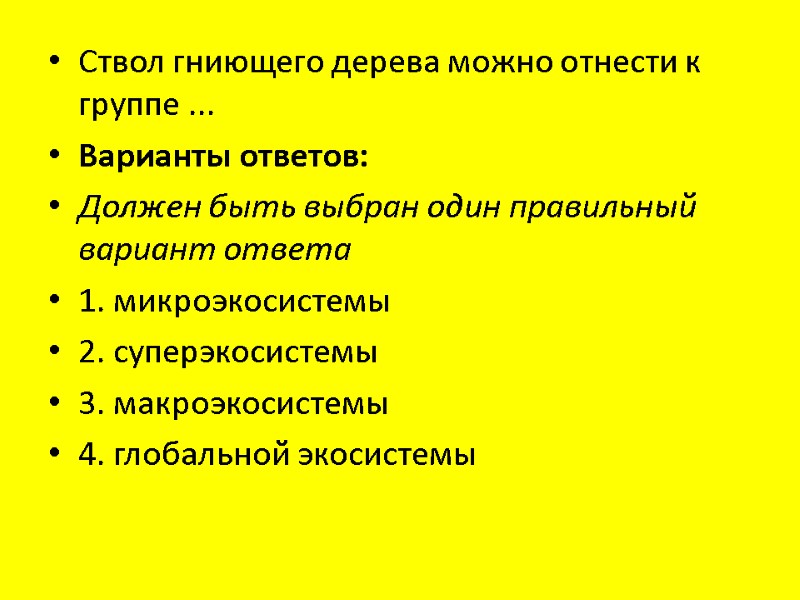 Ствол гниющего дерева можно отнести к группе ... Варианты ответов: Должен быть выбран один правильный вариант ответа 1. микроэкосистемы 2. суперэкосистемы 3. макроэкосистемы 4. глобальной экосистемы