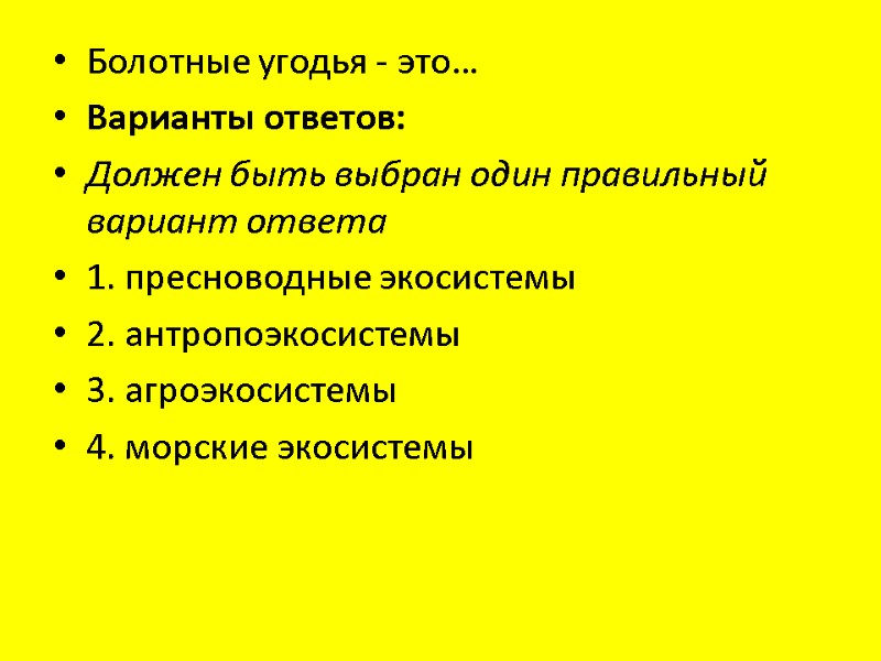 Болотные угодья - это… Варианты ответов: Должен быть выбран один правильный вариант ответа 1. пресноводные экосистемы 2. антропоэкосистемы 3. агроэкосистемы 4. морские экосистемы