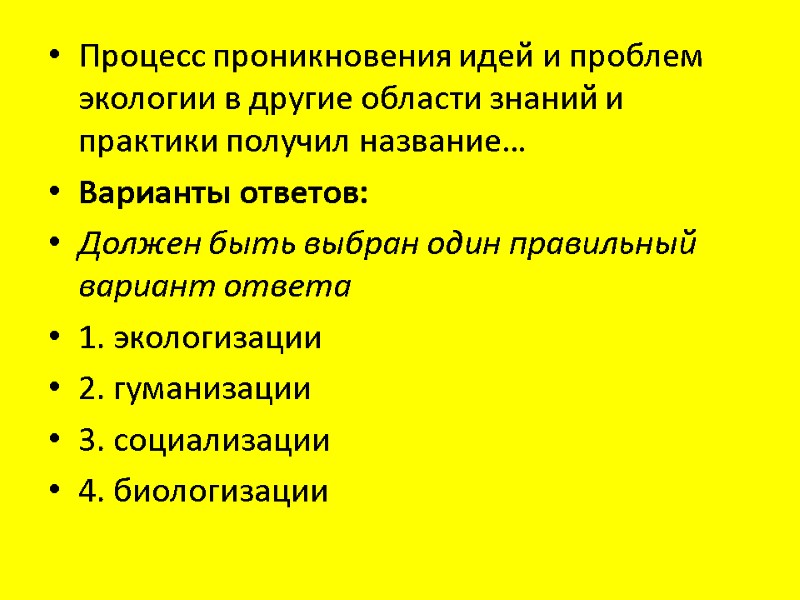 Процесс проникновения идей и проблем экологии в другие области знаний и практики получил название… Варианты ответов: Должен быть выбран один правильный вариант ответа 1. экологизации 2. гуманизации 3. социализации 4. биологизации