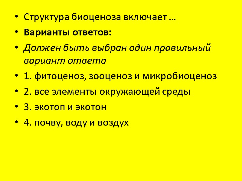 Структура биоценоза включает … Варианты ответов: Должен быть выбран один правильный вариант ответа 1. фитоценоз, зооценоз и микробиоценоз 2. все элементы окружающей среды 3. экотоп и экотон 4. почву, воду и воздух