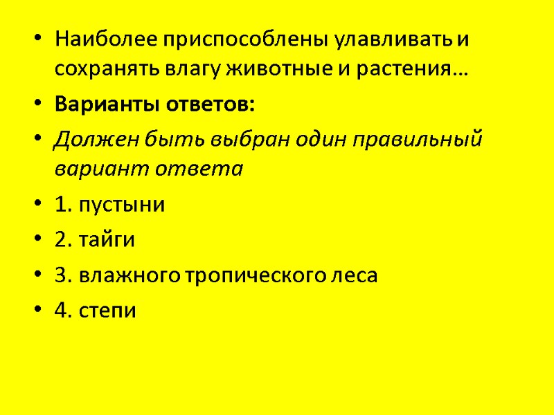 Наиболее приспособлены улавливать и сохранять влагу животные и растения… Варианты ответов: Должен быть выбран один правильный вариант ответа 1. пустыни 2. тайги 3. влажного тропического леса 4. степи