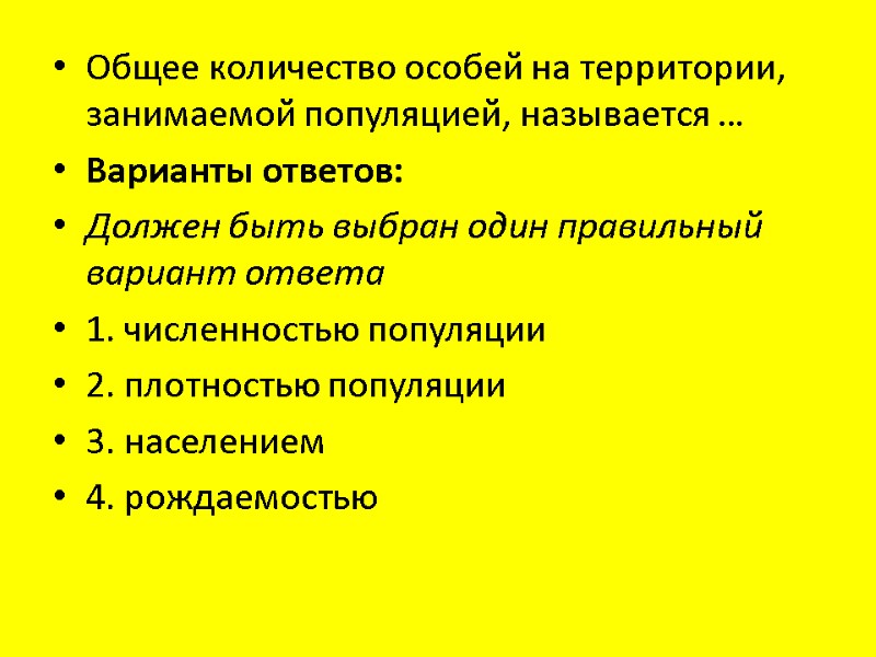 Общее количество особей на территории, занимаемой популяцией, называется … Варианты ответов: Должен быть выбран один правильный вариант ответа 1. численностью популяции 2. плотностью популяции 3. населением 4. рождаемостью