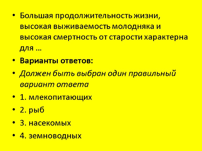 Большая продолжительность жизни, высокая выживаемость молодняка и высокая смертность от старости характерна для … Варианты ответов: Должен быть выбран один правильный вариант ответа 1. млекопитающих 2. рыб 3. насекомых 4. земноводных
