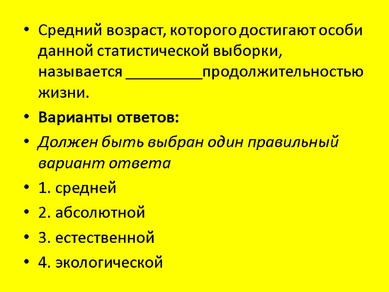 Средний возраст, которого достигают особи данной статистической выборки, называется _________продолжительностью жизни. Варианты ответов: Должен быть выбран один правильный вариант ответа 1. средней 2. абсолютной 3. естественной 4. экологической