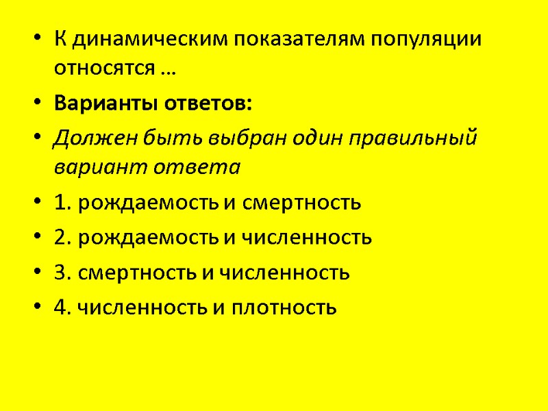 К динамическим показателям популяции относятся … Варианты ответов: Должен быть выбран один правильный вариант ответа 1. рождаемость и смертность 2. рождаемость и численность 3. смертность и численность 4. численность и плотность