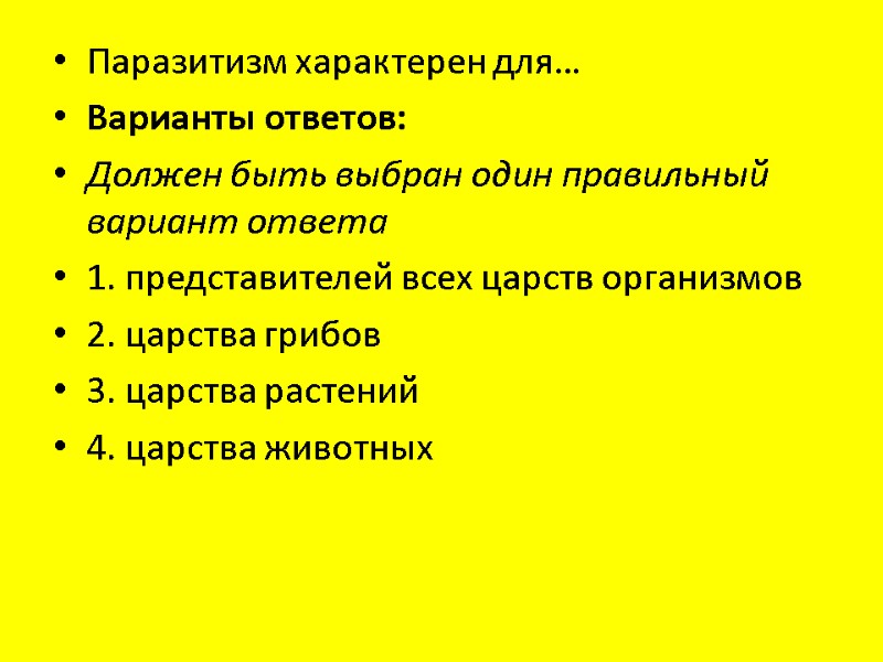 Паразитизм характерен для… Варианты ответов: Должен быть выбран один правильный вариант ответа 1. представителей всех царств организмов 2. царства грибов 3. царства растений 4. царства животных
