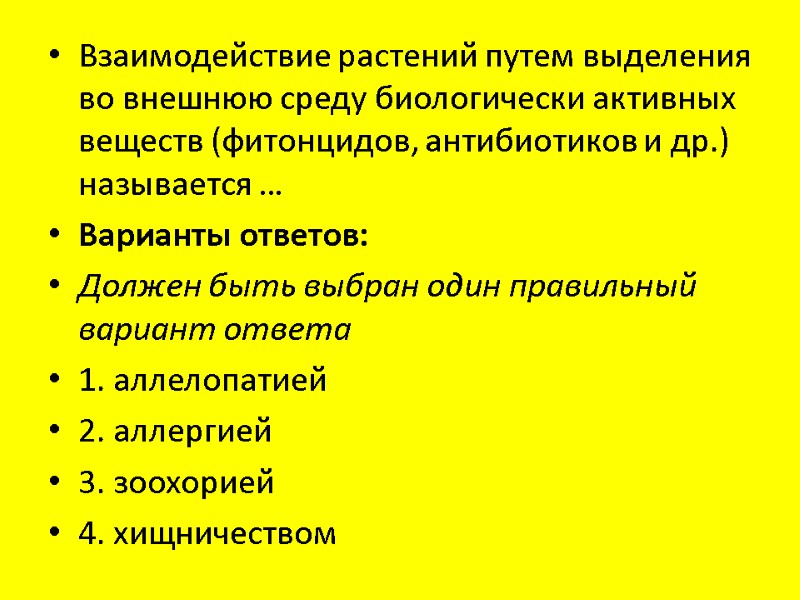 Взаимодействие растений путем выделения во внешнюю среду биологически активных веществ (фитонцидов, антибиотиков и др.) называется … Варианты ответов: Должен быть выбран один правильный вариант ответа 1. аллелопатией 2. аллергией 3. зоохорией 4. хищничеством
