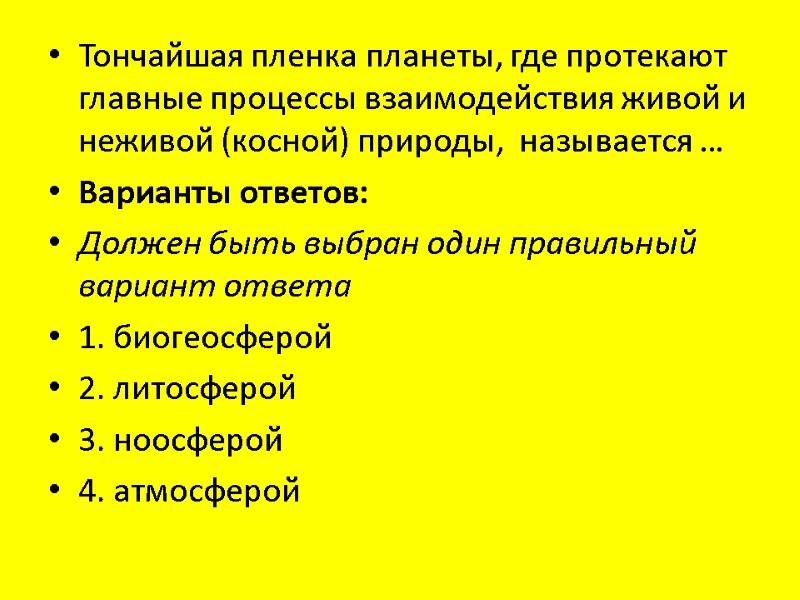 Тончайшая пленка планеты, где протекают главные процессы взаимодействия живой и неживой (косной) природы, называется … Варианты ответов: Должен быть выбран один правильный вариант ответа 1. биогеосферой 2. литосферой 3. ноосферой 4. атмосферой