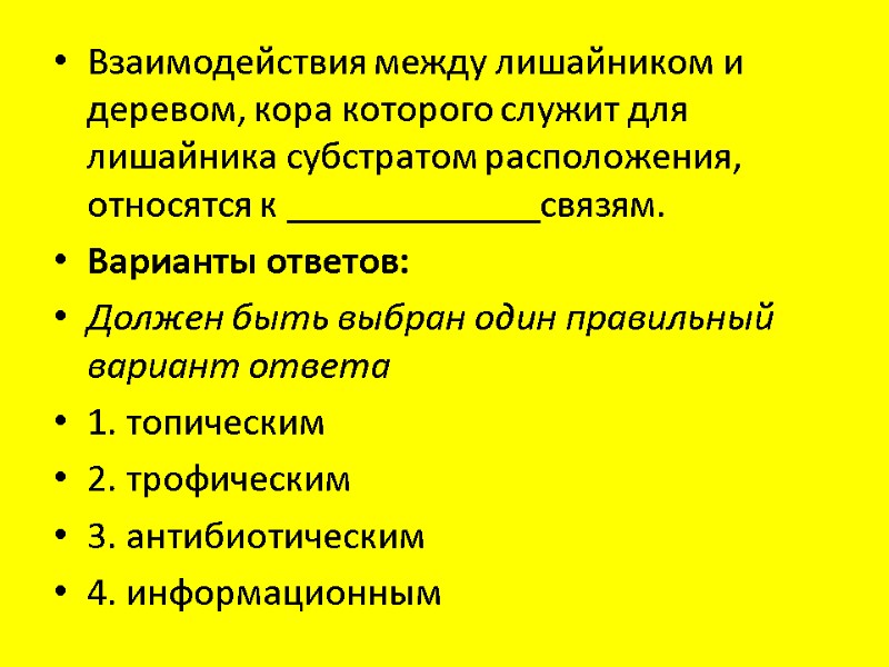 Взаимодействия между лишайником и деревом, кора которого служит для лишайника субстратом расположения, относятся к _____________связям. Варианты ответов: Должен быть выбран один правильный вариант ответа 1. топическим 2. трофическим 3. антибиотическим 4. информационным
