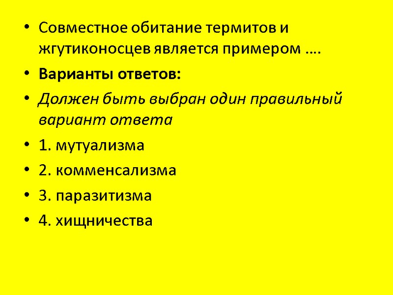 Совместное обитание термитов и жгутиконосцев является примером …. Варианты ответов: Должен быть выбран один правильный вариант ответа 1. мутуализма 2. комменсализма 3. паразитизма 4. хищничества