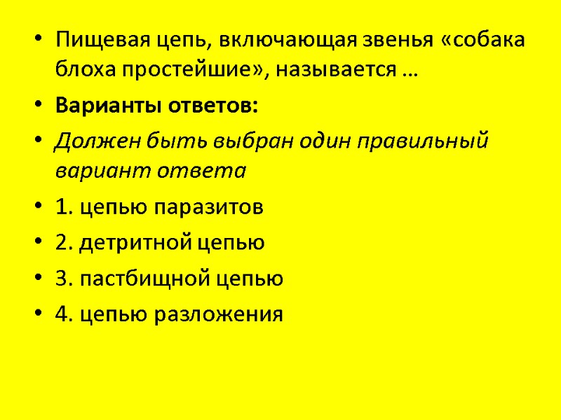Пищевая цепь, включающая звенья «собака блоха простейшие», называется … Варианты ответов: Должен быть выбран один правильный вариант ответа 1. цепью паразитов 2. детритной цепью 3. пастбищной цепью 4. цепью разложения