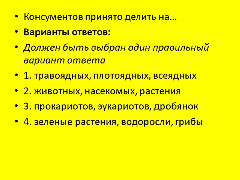 Консументов принято делить на… Варианты ответов: Должен быть выбран один правильный вариант ответа 1. травоядных, плотоядных, всеядных 2. животных, насекомых, растения 3. прокариотов, эукариотов, дробянок 4. зеленые растения, водоросли, грибы