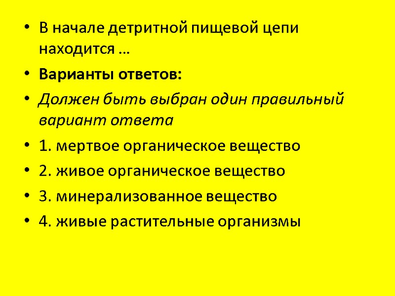 В начале детритной пищевой цепи находится … Варианты ответов: Должен быть выбран один правильный вариант ответа 1. мертвое органическое вещество 2. живое органическое вещество 3. минерализованное вещество 4. живые растительные организмы