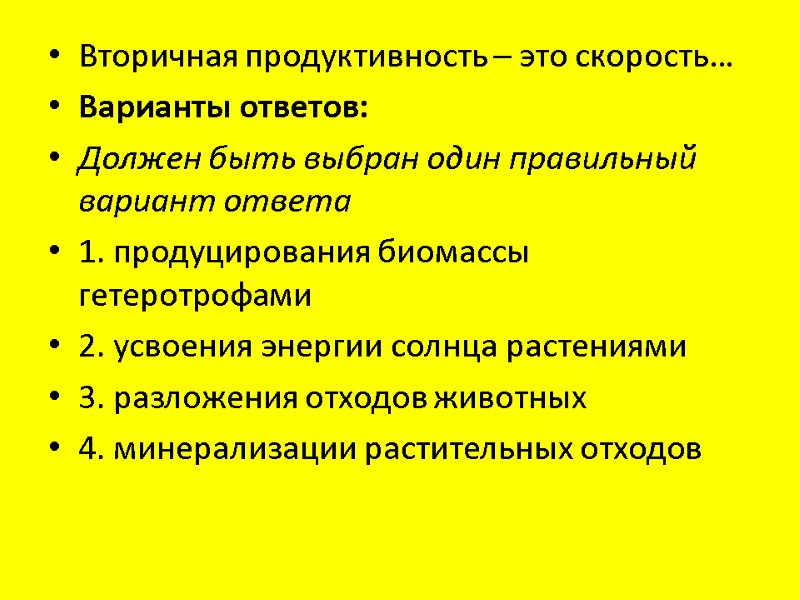 Вторичная продуктивность – это скорость… Варианты ответов: Должен быть выбран один правильный вариант ответа 1. продуцирования биомассы гетеротрофами 2. усвоения энергии солнца растениями 3. разложения отходов животных 4. минерализации растительных отходов