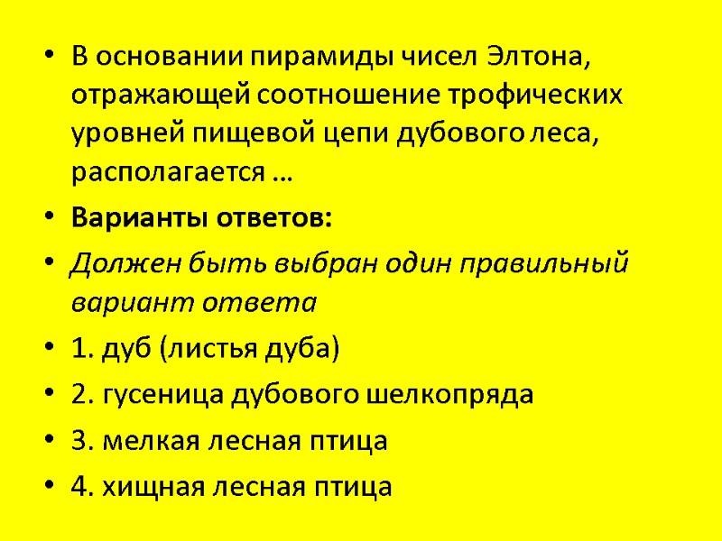 В основании пирамиды чисел Элтона, отражающей соотношение трофических уровней пищевой цепи дубового леса, располагается … Варианты ответов: Должен быть выбран один правильный вариант ответа 1. дуб (листья дуба) 2. гусеница дубового шелкопряда 3. мелкая лесная птица 4. хищная лесная птица