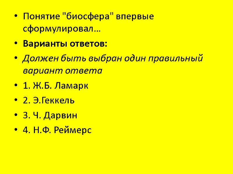 Понятие "биосфера" впервые сформулировал… Варианты ответов: Должен быть выбран один правильный вариант ответа 1. Ж.Б. Ламарк 2. Э.Геккель 3. Ч. Дарвин 4. Н.Ф. Реймерс