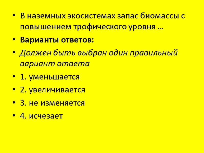 В наземных экосистемах запас биомассы с повышением трофического уровня … Варианты ответов: Должен быть выбран один правильный вариант ответа 1. уменьшается 2. увеличивается 3. не изменяется 4. исчезает