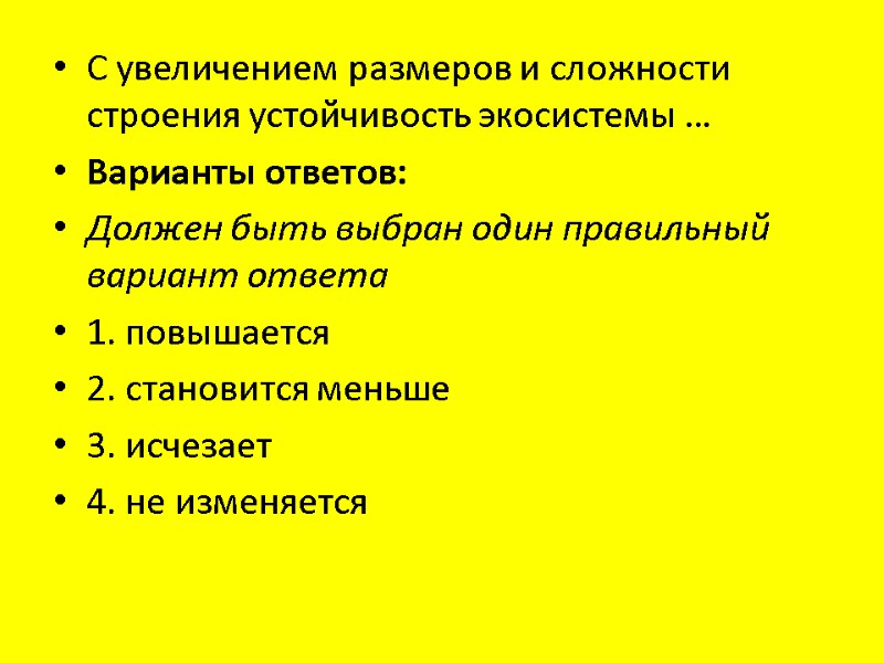 С увеличением размеров и сложности строения устойчивость экосистемы … Варианты ответов: Должен быть выбран один правильный вариант ответа 1. повышается 2. становится меньше 3. исчезает 4. не изменяется
