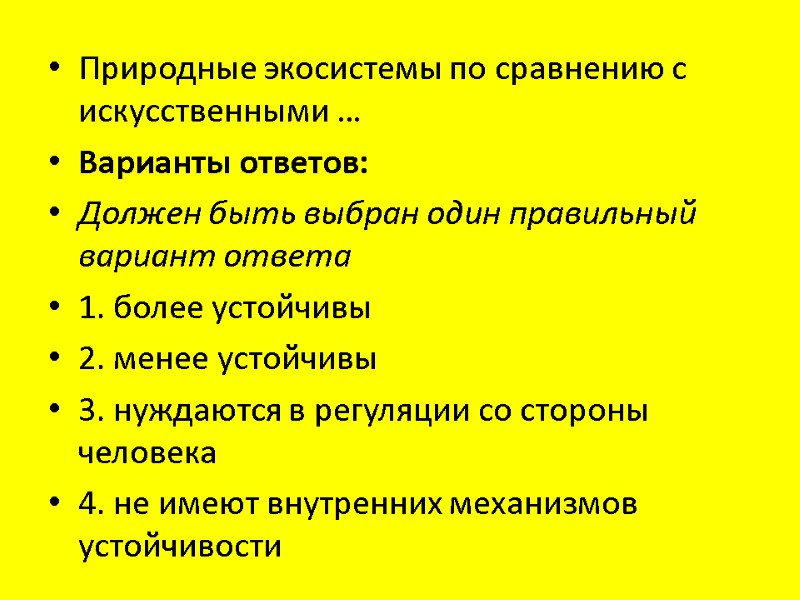 Природные экосистемы по сравнению с искусственными … Варианты ответов: Должен быть выбран один правильный вариант ответа 1. более устойчивы 2. менее устойчивы 3. нуждаются в регуляции со стороны человека 4. не имеют внутренних механизмов устойчивости