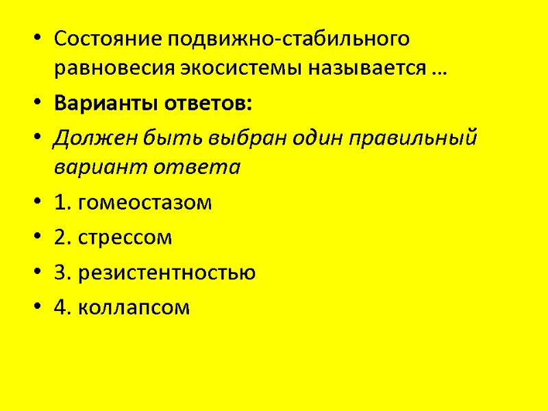 Состояние подвижно-стабильного равновесия экосистемы называется … Варианты ответов: Должен быть выбран один правильный вариант ответа 1. гомеостазом 2. стрессом 3. резистентностью 4. коллапсом