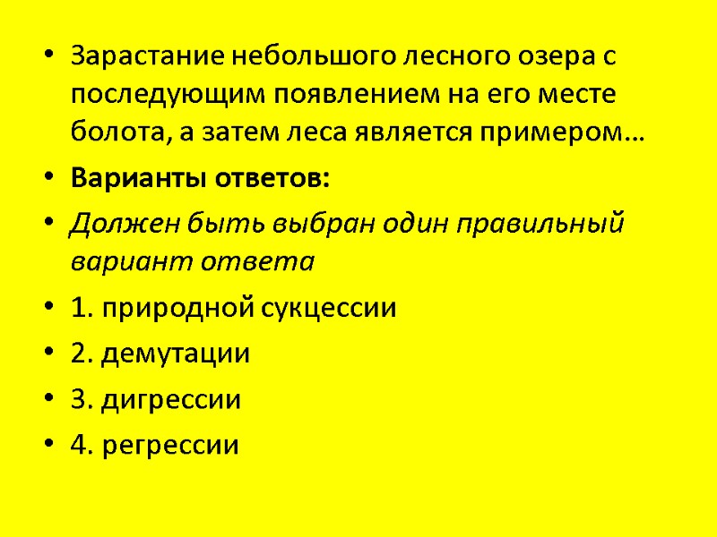 Зарастание небольшого лесного озера с последующим появлением на его месте болота, а затем леса является примером… Варианты ответов: Должен быть выбран один правильный вариант ответа 1. природной сукцессии 2. демутации 3. дигрессии 4. регрессии