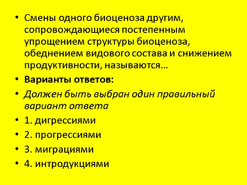 Смены одного биоценоза другим, сопровождающиеся постепенным упрощением структуры биоценоза, обеднением видового состава и снижением продуктивности, называются… Варианты ответов: Должен быть выбран один правильный вариант ответа 1. дигрессиями 2. прогрессиями 3. миграциями 4. интродукциями