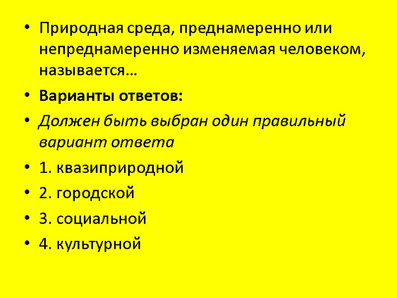Природная среда, преднамеренно или непреднамеренно изменяемая человеком, называется… Варианты ответов: Должен быть выбран один правильный вариант ответа 1. квазиприродной 2. городской 3. социальной 4. культурной