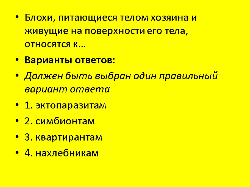 Блохи, питающиеся телом хозяина и живущие на поверхности его тела, относятся к… Варианты ответов: Должен быть выбран один правильный вариант ответа 1. эктопаразитам 2. симбионтам 3. квартирантам 4. нахлебникам