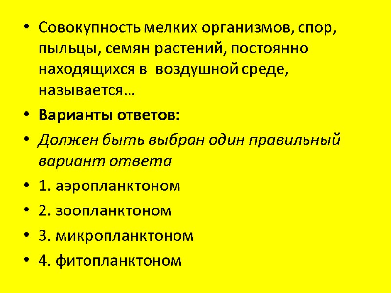 Совокупность мелких организмов, спор, пыльцы, семян растений, постоянно находящихся в воздушной среде, называется… Варианты ответов: Должен быть выбран один правильный вариант ответа 1. аэропланктоном 2. зоопланктоном 3. микропланктоном 4. фитопланктоном
