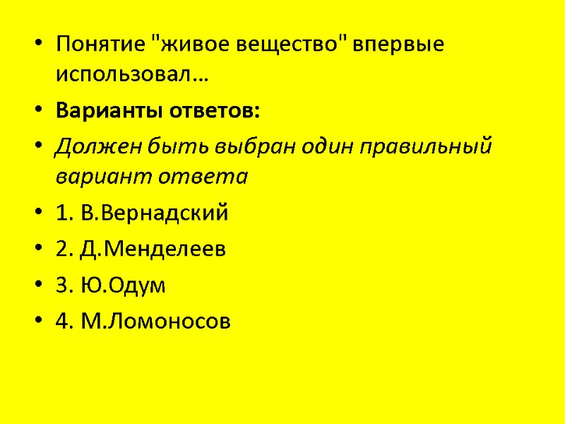 Понятие "живое вещество" впервые использовал… Варианты ответов: Должен быть выбран один правильный вариант ответа 1. В.Вернадский 2. Д.Менделеев 3. Ю.Одум 4. М.Ломоносов