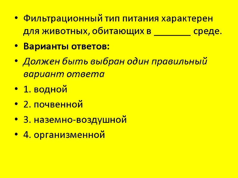 Фильтрационный тип питания характерен для животных, обитающих в _______ среде. Варианты ответов: Должен быть выбран один правильный вариант ответа 1. водной 2. почвенной 3. наземно-воздушной 4. организменной