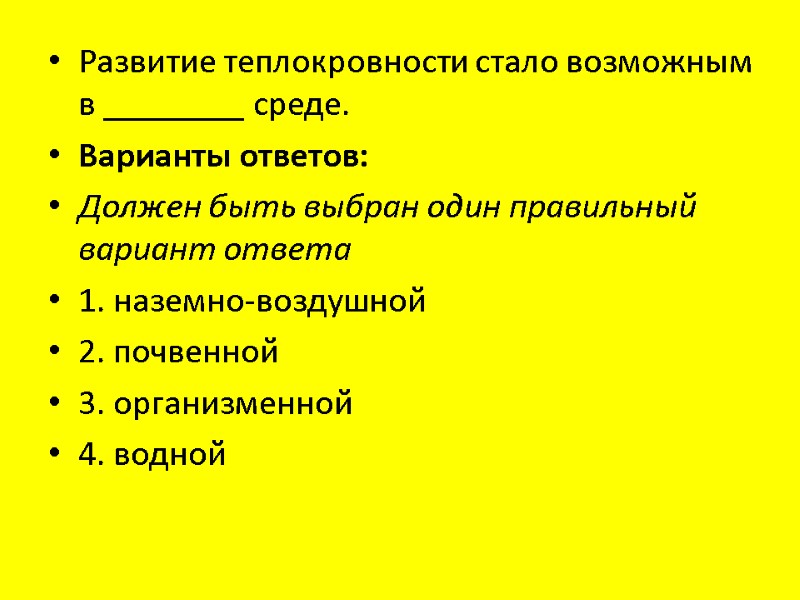 Развитие теплокровности стало возможным в ________ среде. Варианты ответов: Должен быть выбран один правильный вариант ответа 1. наземно-воздушной 2. почвенной 3. организменной 4. водной