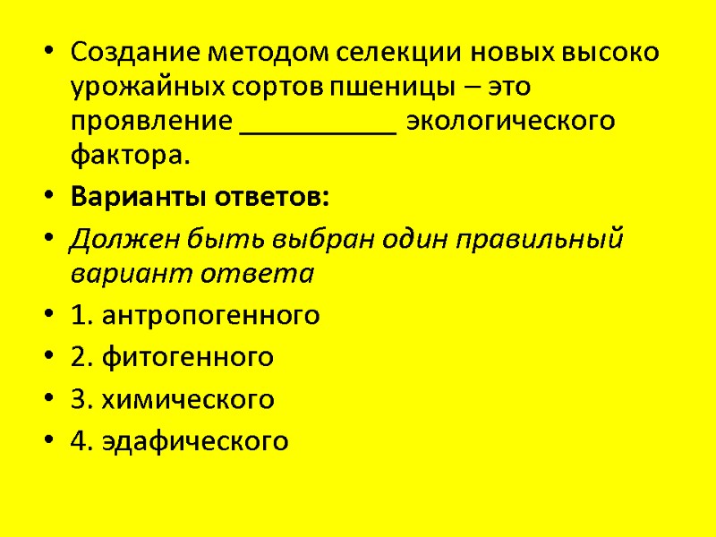 Создание методом селекции новых высоко урожайных сортов пшеницы – это проявление __________ экологического фактора. Варианты ответов: Должен быть выбран один правильный вариант ответа 1. антропогенного 2. фитогенного 3. химического 4. эдафического
