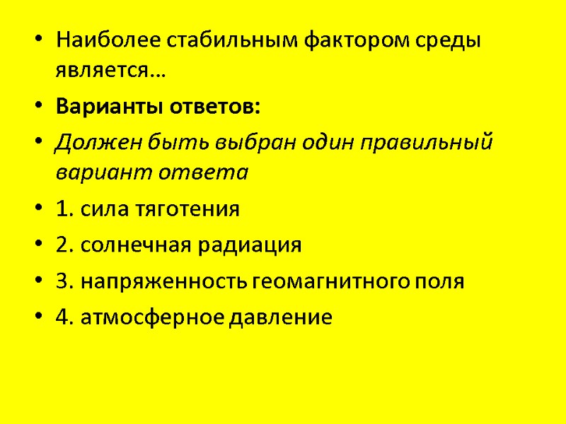 Наиболее стабильным фактором среды является… Варианты ответов: Должен быть выбран один правильный вариант ответа 1. сила тяготения 2. солнечная радиация 3. напряженность геомагнитного поля 4. атмосферное давление