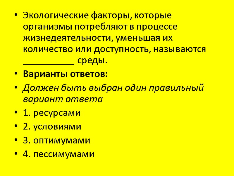Экологические факторы, которые организмы потребляют в процессе жизнедеятельности, уменьшая их количество или доступность, называются __________ среды. Варианты ответов: Должен быть выбран один правильный вариант ответа 1. ресурсами 2. условиями 3. оптимумами 4. пессимумами