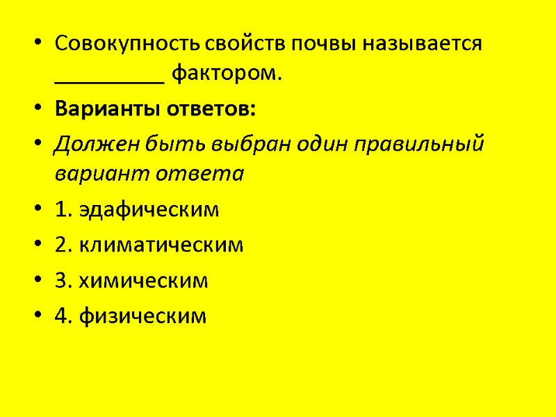 Совокупность свойств почвы называется _________ фактором. Варианты ответов: Должен быть выбран один правильный вариант ответа 1. эдафическим 2. климатическим 3. химическим 4. физическим